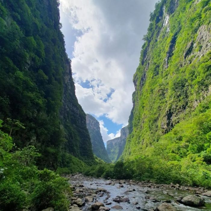 Diferente das outras trilhas do Cânion Itaimbezinho que são realizadas pela parte alta, a Trilha do Rio do Boi é realizada pela parte de baixo, pelo leito do rio. É uma trilha muito interessante em razão da paisagem peculiar entre as paredes gigantescas do cânion.